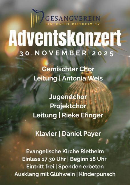 Der Gesangverein Eintracht Rietheim beendet sein Jubiläumsjahr mit einem großen Adventskonzert in der evangelischen Kirche in Rietheim. Wir freuen uns sehr, dass am Sonntag, den 30. November um 18 Uhr der Gemischte Chor, der Jugendchor und der Projektchor zu einem abwechslungsreichen Konzert einladen.